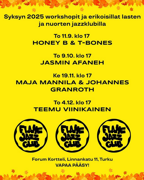 Flame Jazz Clubille ei tarvita ennakkoilmoittautumista ja klubille on aina vapaa pääsy. Lämpimästi tervetuloa!